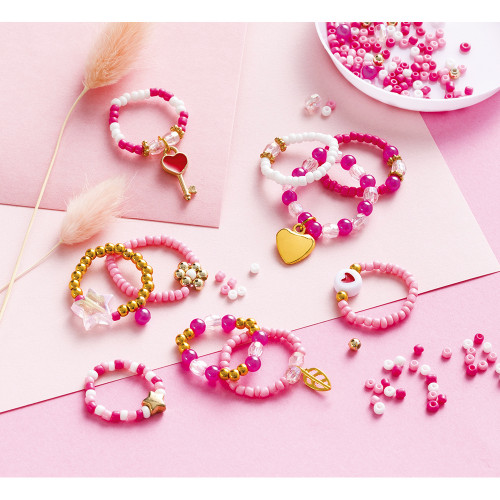 Crea adorabili gioielli! Con questo kit creativo si possono realizzare 10 anelli con perline in uno stile adorabile. Rosa, oro, cuori, stelle… Per un look davvero romantico! Questa attività di creazione di gioielli con perline è ideale per stimolare la destrezza dei bambini e consentire loro di esprimere la propria creatività. Per guidare i bambini nella creazione dei loro affascinanti anelli, è incluso anche un libretto con schemi e istruzioni.