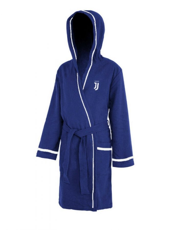 Accappatoio in microspugna della Juventus dotato di cappuccio, tasca e cintura. Realizzato in morbidissima spugna rasata di puro cotone è ideale nello sport o nell’uso di tutti i giorni asciugando in fretta la pelle. È perfetto anche in viaggio, in palestra o in piscina perché occupa davvero poco spazio. Prodotto ufficiale Juventus FC.