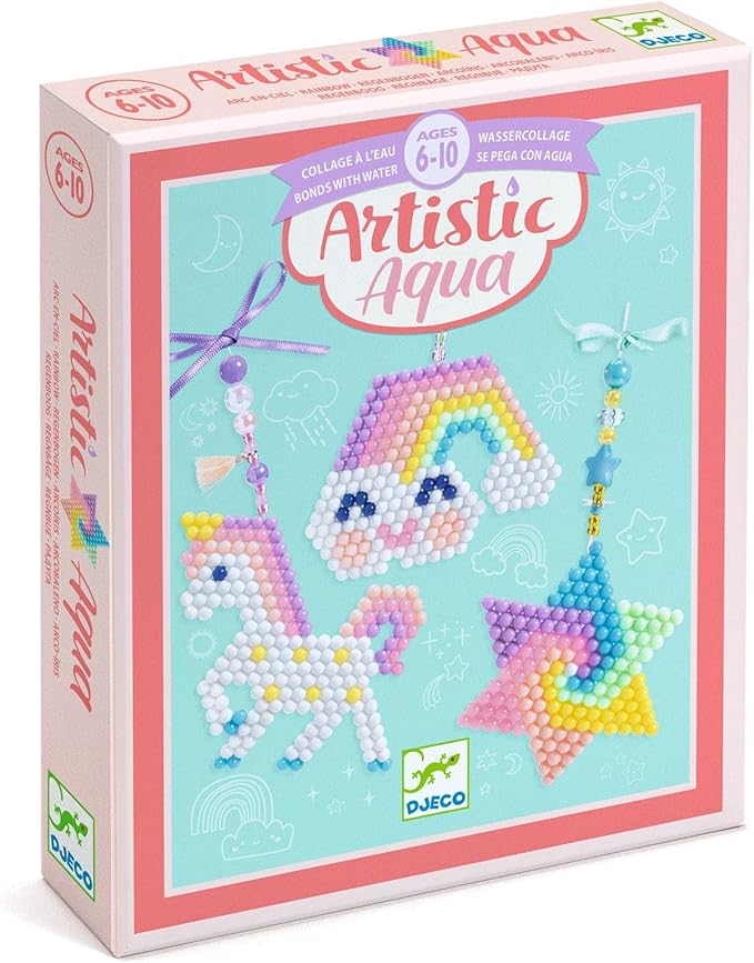 Un fantastico set creativo di Djeco per creare tre opere d’arte dai colori pastello con perline che si attaccano all’acqua. Il bambino posiziona il modello sotto la tavoletta trasparente a nido d’ape. Le perline colorate vengono posizionate sulla tavoletta come indicato dal modello e poi spruzzate con acqua. Una volta asciutte, le perline rimangono saldamente attaccate tra loro come per magia! Le perline e i pendenti vengono poi infilati sul nastro per trasformare le creazioni in graziosi pendenti. I piccoli artisti adoreranno questa attività. * Magia! Quando le perline entrano in contatto con l’acqua, si attaccano. * La tavoletta trasparente permette di riprodurre i modelli in modo che traspaiano. * La tavoletta a nido d’ape assicura che le perline rimangano in posizione mentre si disegna il modello. * Numerosi accessori per decorare i pendenti. * 1 manuale di istruzioni dettagliato passo dopo passo. * Realizzato in carta e cartone certificati. * Contenuto: 1 superficie di lavoro, 1 flacone spray, 1 selezione coordinata di perline di plastica che si attaccano quando esposte all’acqua (8 colori), perline e ciondoli, filato trasparente ed elastico, nastri, 1 ago, 1 infila-filo, 1 istruzioni passo passo per colorare. * Età: 6-10 anni * Modello: DJ09484 * Dimensioni della confezione: 16 x 19 x 5 cm
