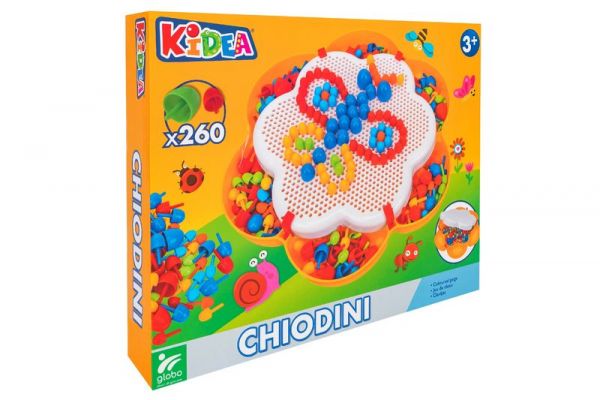 mitici chiodini con cui potrai riprodurre colorati mosaici e disegni. Attività divertente, creativa ed educativa, che stimola la sensibilità cromatica, addestra la coordinazione occhio-mano e sviluppa le capacità manipolative. Contiene 260 chiodini, 1 tavoletta traforata e 1 comodo cestello entrambi a forma di fiore.