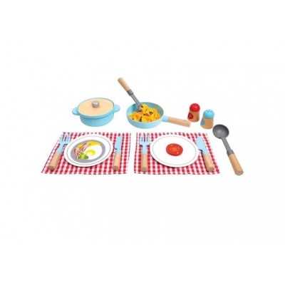 Cuoci e servi LITTLE CHEF COOKING & SERVE PLAY SET in legno, plastica e stoffa, di Hape. Scopri il set cuoci e servi Hape, un’allegra dinette per preparare tante bontà e servirle a due commensali. Nel menù di oggi… pasta al pomodoro! Questa scatola delizierà ragazze e ragazzi. Contiene tutto l’occorrente per preparare una deliziosa pappa per le vostre bambole o i vostri peluche: tovagliette di stoffa, piatti, posate, una casseruola, una padella, un mestolo, una saliera, una pepaiola, la pasta… Un’ottima idea regalo per i bambini che amano giocare con le bambole e amano la cucina, per un compleanno…