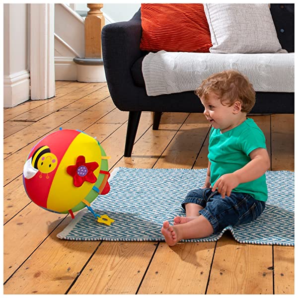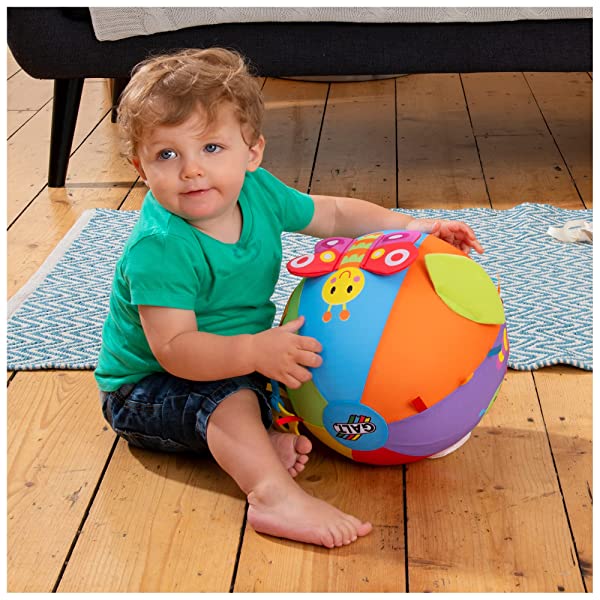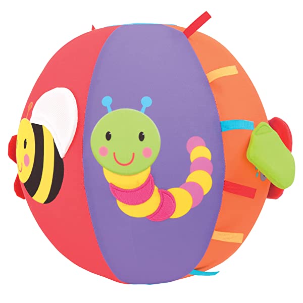 Attività palla è una grande palla gonfiabile in tessuto con sei multisensory attività e nastri colorati, Tag Attività includono un massaggiagengive Squeaky ad ala di farfalla, fiore in una tasca, piega petali, shiny Bee Wing, Furry Caterpillar e peep-o foglia