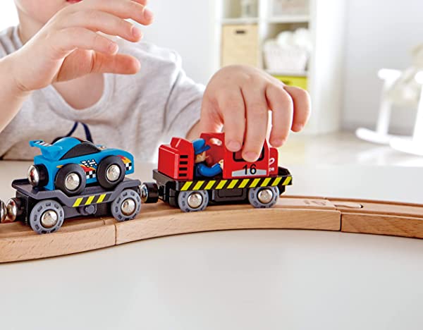 Set di treni: include motore con driver rimovibile TRASPORTATORE: Ogni carrello trasportatore ha una rampa di carico che si piega verso il basso DRIVER: il tetto del motore scorre indietro in modo che il conducente possa essere posizionato all’interno e rimosso EXTRAS: comprende anche due auto da corsa Compatibilità: compatibile con Hape e altre principali ferrovie in legno.