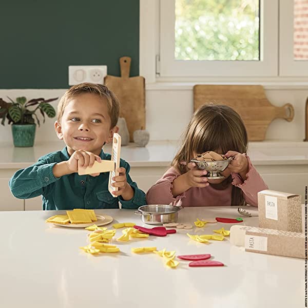 - CARATTERISTICHE: Contiene 20 farfalle in feltro e 10 tagliatelle in nastro di cotone con 2 confezioni in cartone, 4 ravioli, una fetta di parmigiano, una grattugia in legno, 4 pomodori in legno, 6 foglie di basilico, 5 funghi, salsa in feltro, casseruola, scolapasta, mestolo in metallo e un piatto in legno; materiale(i) utilizzato(i): Legno (schima, compensato e pino), cartone, feltro; fascia d’età consigliata: Da 3 anni a 10 anni