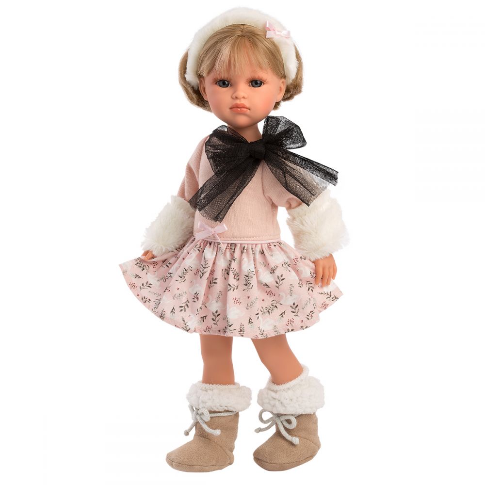 Daniela, che misura 37 cm, è opera della marca spagnola Llorens, che fa ogni sforzo per garantire che i suoi giocattoli siano unici. Questa bellissima dama indossa un abito svasato a fantasia di cigni con maniche in pelliccia e fiocco in tulle nero, fascia per capelli in pelliccia, calzini e scarpe in pelliccia. Daniela è bellissima, con grandi occhi azzurri con lunghe ciglia, labbra carnose e corti capelli biondi. La bambola è realizzata in vinile morbido al tatto. Le sue braccia, gambe e testa sono mobili, quindi la bambola può assumere varie pose. È un fantastico giocattolo e una decorazione per la stanza dei bambini. La…