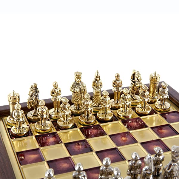 SET DI SCACCHI IMPERO BIZANTINO In Scatola di Legno Con Contenitore con Scacchi Oro/Argento e Scacchiera in Bronzo 20 x 20 cm (Extra Small) La leggenda L’impero più longevo di tutti i tempi è esistito e ha governato la parte orientale dell’Europa per più di 1000 anni. La continuazione ortodossa dell’Impero Romano, noto come Impero Bizantino, si espanse in modo significativo con le crociate vittoriose in Oriente e in Occidente. La loro cultura era formata dalla civiltà greca e la loro lingua era il greco. I bizantini conservarono e copiarono anche manoscritti classici, e sono quindi considerati trasmettitori della conoscenza…