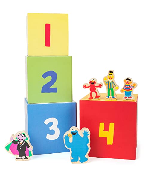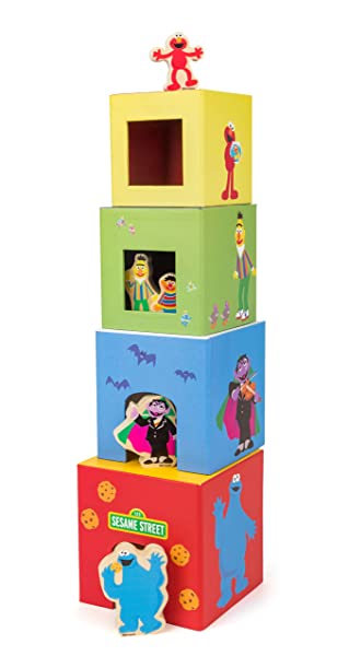 - Set torre da accatastare 9-pezzi con diversi mattoncini colorati di media grandezza in robusto cartone comprensiva delle cinque amate statuine sesame street