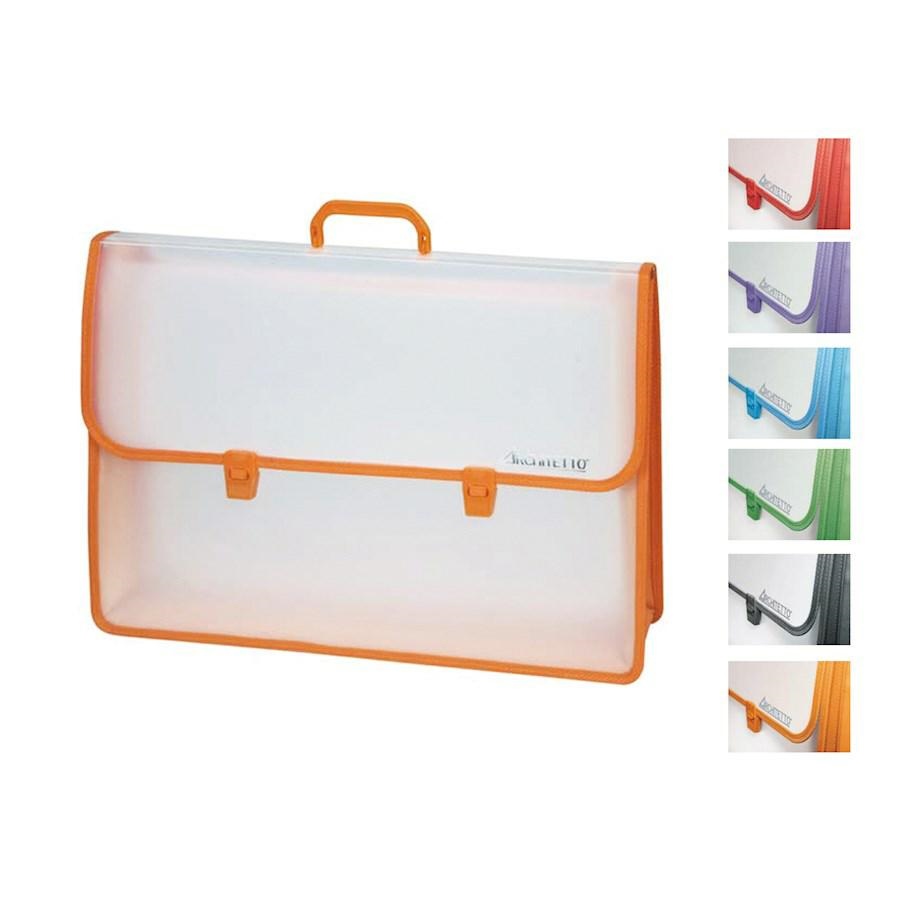 Valigetta in robusta plastica traslucente con bordi e soffietto in tessuto. Disponibile in 6 colori assortiti: nero, rosso, azzurro, verde, arancio e viola.