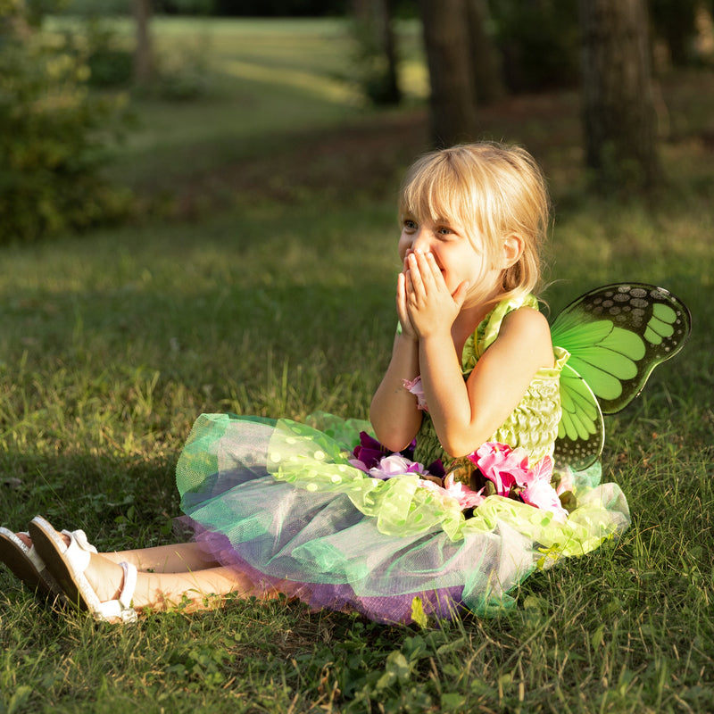 Great Pretenders ha realizzato per le bambine più sognanti, questo vestito di lusso “Fiore delle fate” dai colori magici e dalla qualità eccezionale. La parte superiore del vestito è in raso che permette alla tua fatina di essere libera come l’aria. Così, sarà in grado di far viaggiare la sua mente con la massima flessibilità. La gonna in tulle stampato, composta da diversi strati di tessuto verde e viola, volteggia quando corre. Questo vestito è perfetto per feste di Carnevale, Halloween ma anche per un pomeriggio di gioco con gli amici.