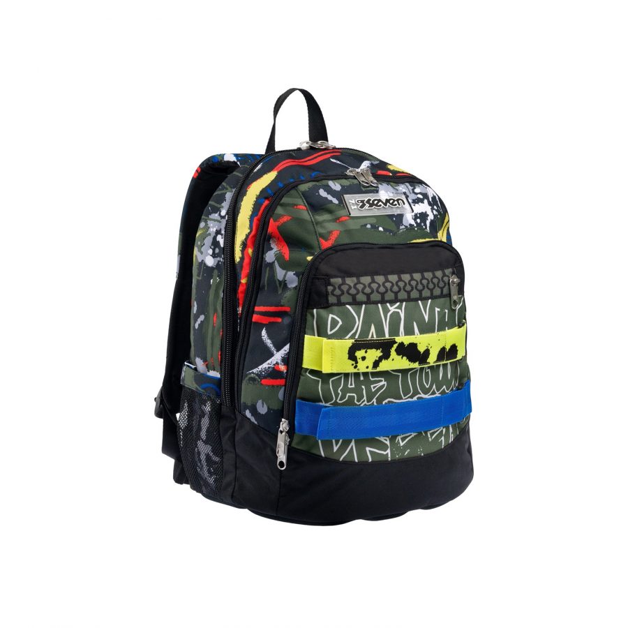 Caratteristiche: zaino doppio scomparto con apertura dello scomparto principale facilitata, fondo integrato e nastri ferma materiale chiudibili con velcro applicati su tasca frontale. Maxi zip stampata e nuova etichetta in gomma personalizzata con logo SEVEN