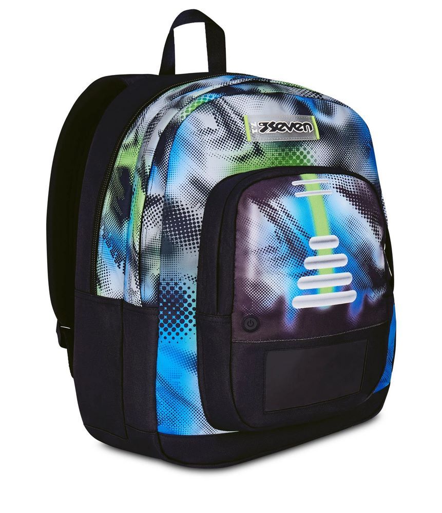Zaino scuola Seven Freethink. Zaino realizzato in robusto poliestere, schienale in Ergosystem preformato con fondo integrato, spallacci imbottiti e traspiranti, maniglia superiore. Due ampie tasche principali chiuse da zip e una maxi tasca frontale attrezzata. Garanzia 4 annie. Dispositivo LED su tasca frontale. Lo puoi programmare da smartphone tramite apposita App, permettendo di scrivere o disegnare tutto ciò che vuoi.