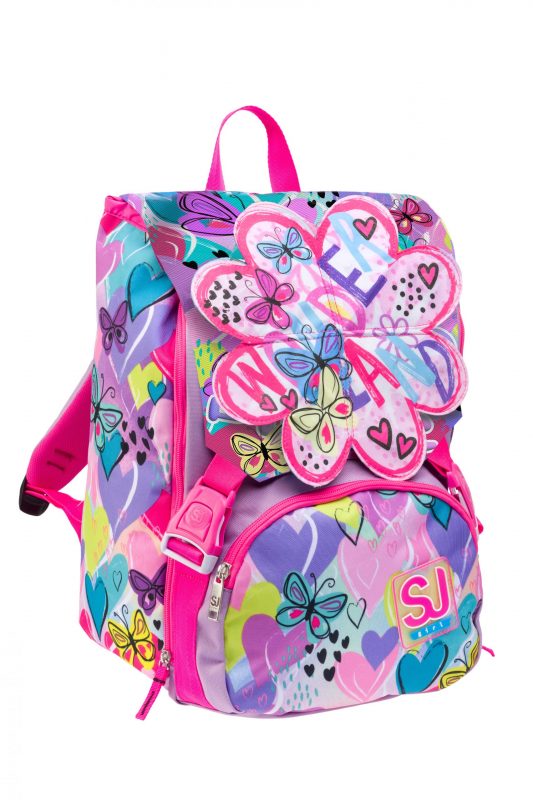 - Caratteristiche: zaino estensibile tramite zip laterali, dotato di inserti rifrangenti. Flip scintillante calamitato a forma di cuore che si trasforma in un fiore una volta aperto
